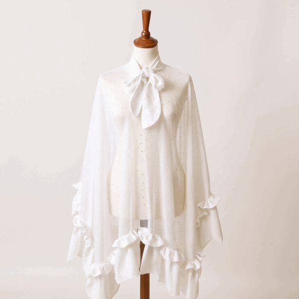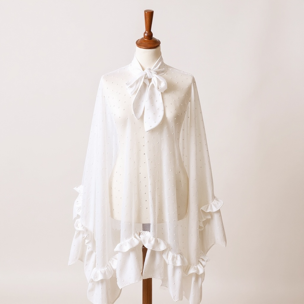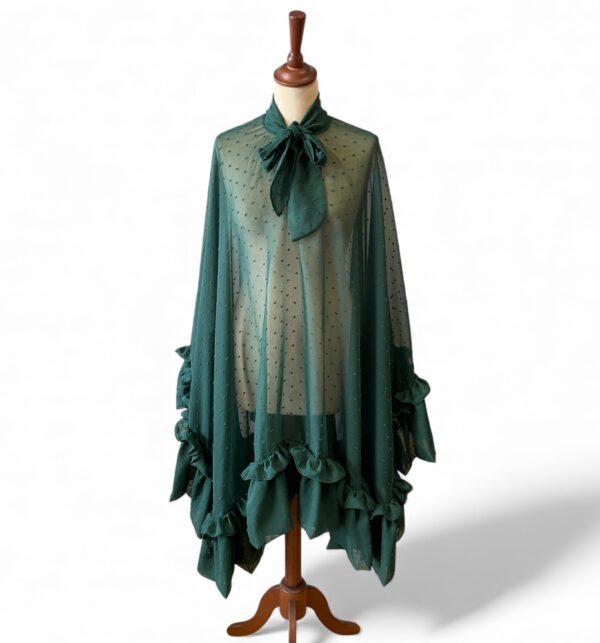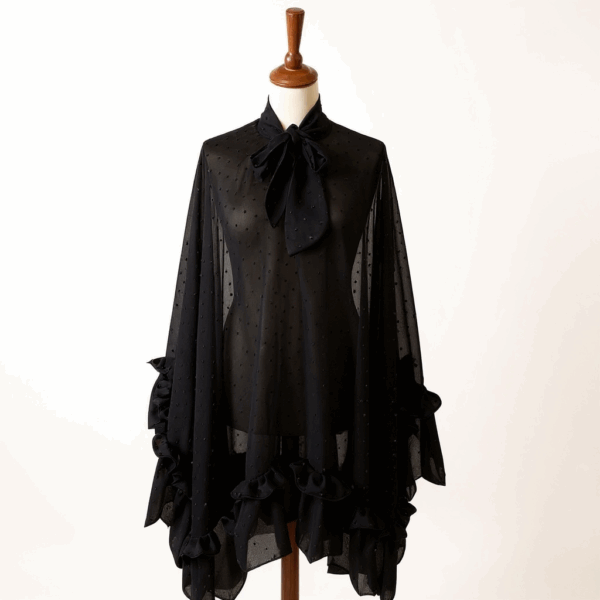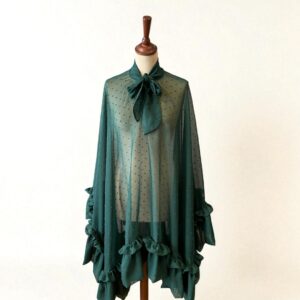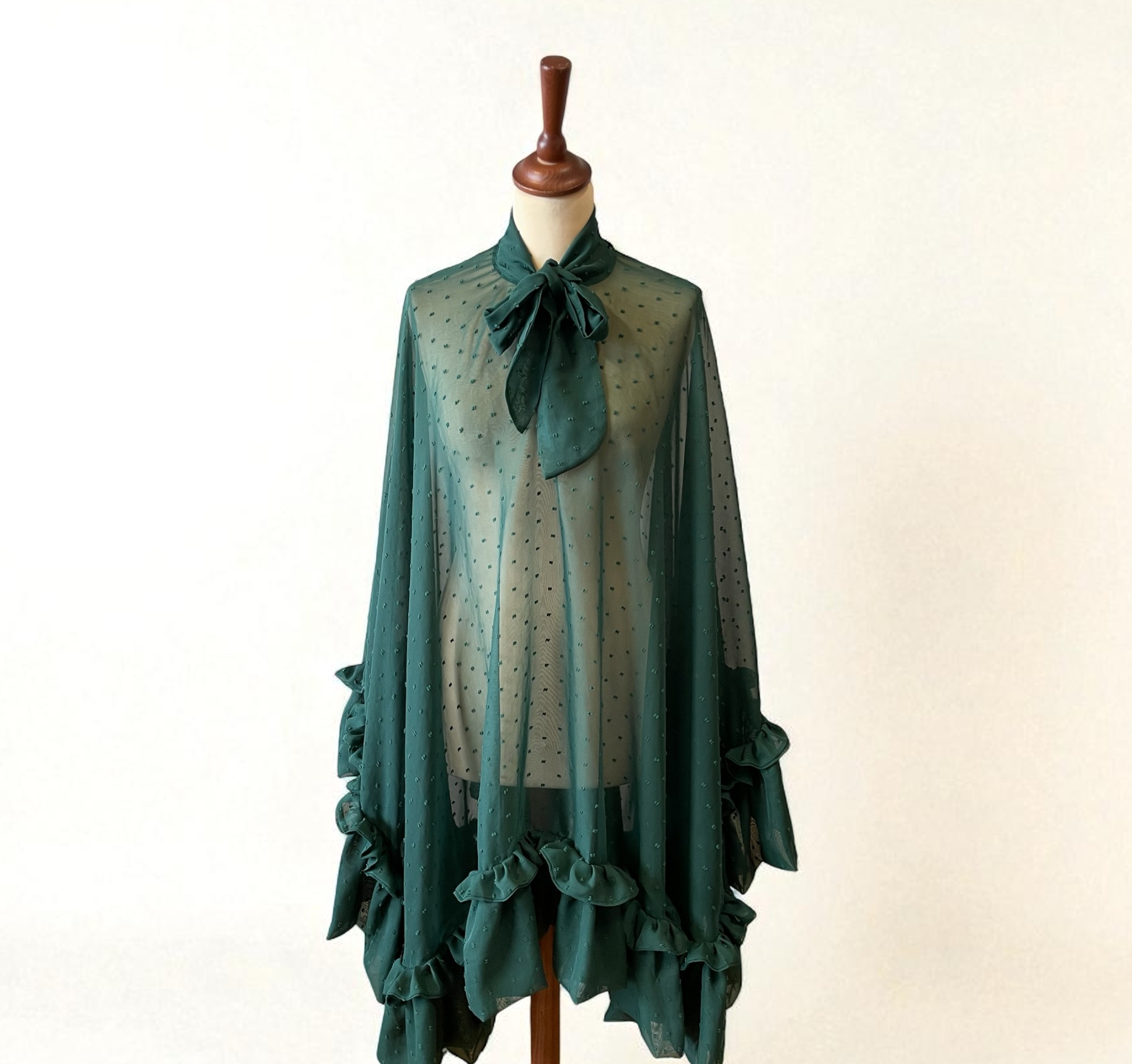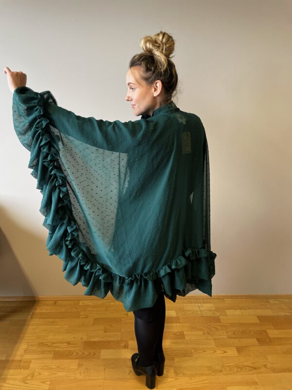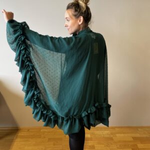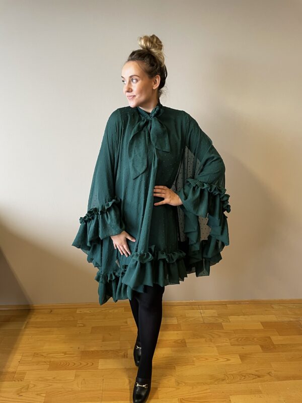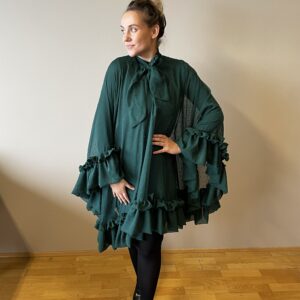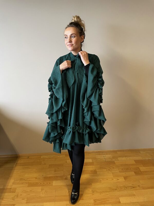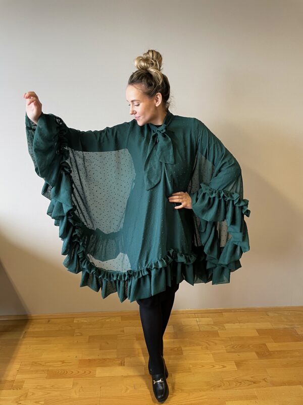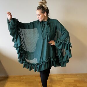 Kjóllinn eða sláin kemur í einni stærð. Hægt að nota með buxum, kjól eða pilsi undir. Einnig er hægt að taka hana saman í mittinu með belti.