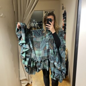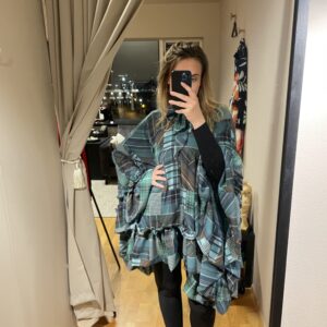 Kjóllinn eða sláin kemur í einni stærð. Hægt að nota með buxum, kjól eða pilsi undir. Einnig er hægt að taka hana saman í mittinu með belti.